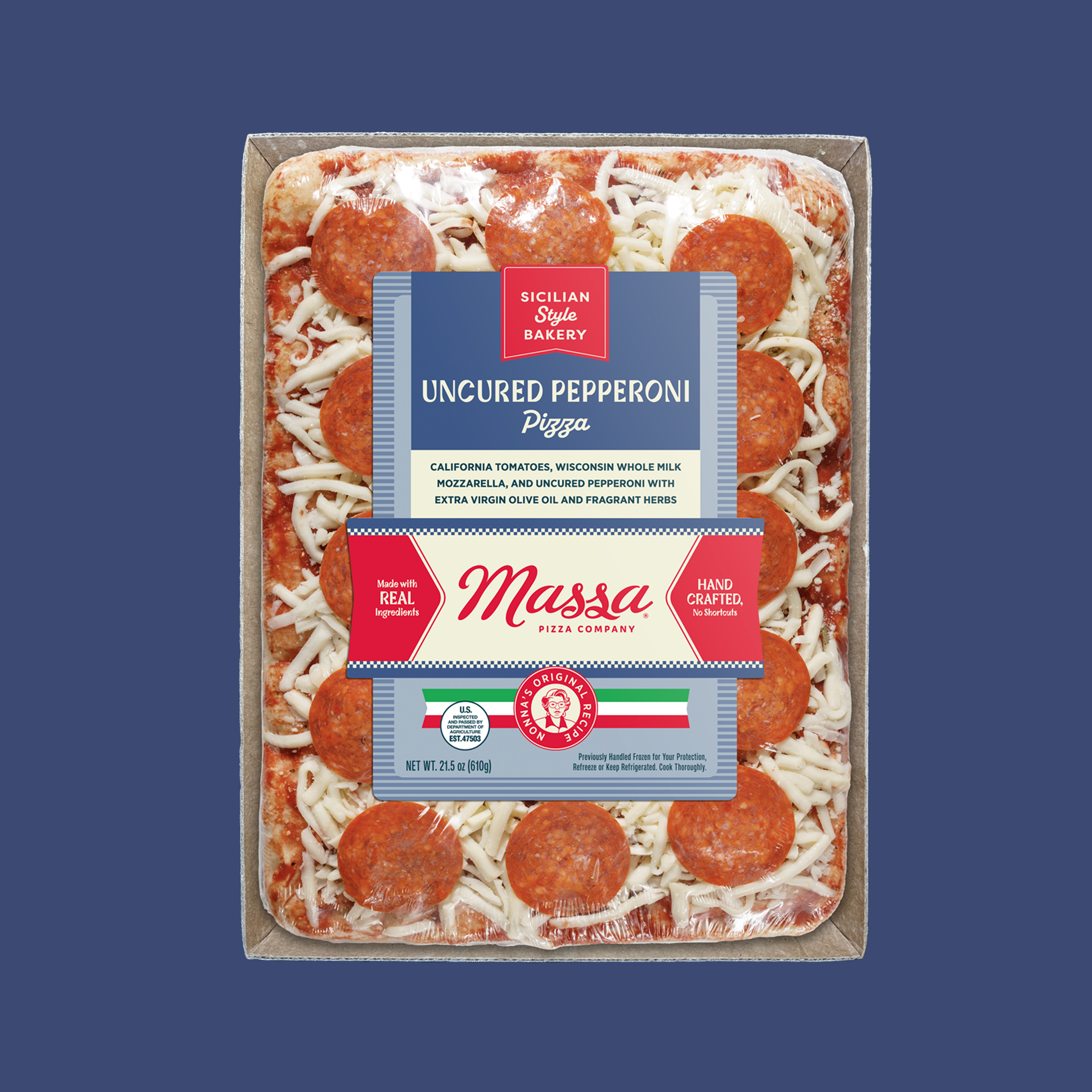 Our Sicilian style bakery pizza is handmade fresh then frozen. We use high quality all natural ingredients including fresh produce, high-end meats, cheeses from Grande & BelGioioso, and a freshly baked crust. Our hand-formed Sicilian bakery pizza crust is fermented for 48 hours and hand docked in extra virgin olive oil for deep flavor with a thick but light, exceptionally crispy crust.